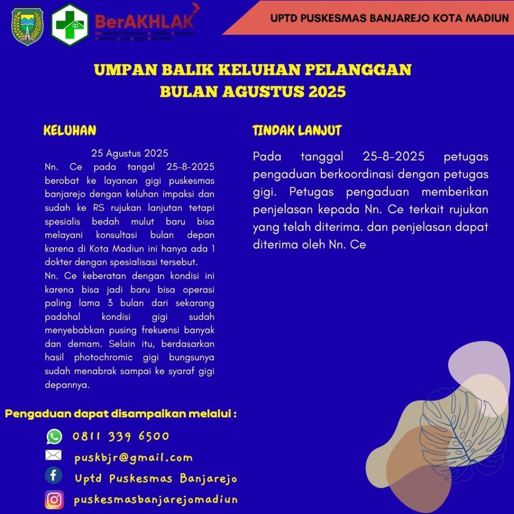 Berikut kami sampaikan Umpan Balik Keluhan Pelanggan di Puskesmas Banjarejo bulan Agustus 2025.
