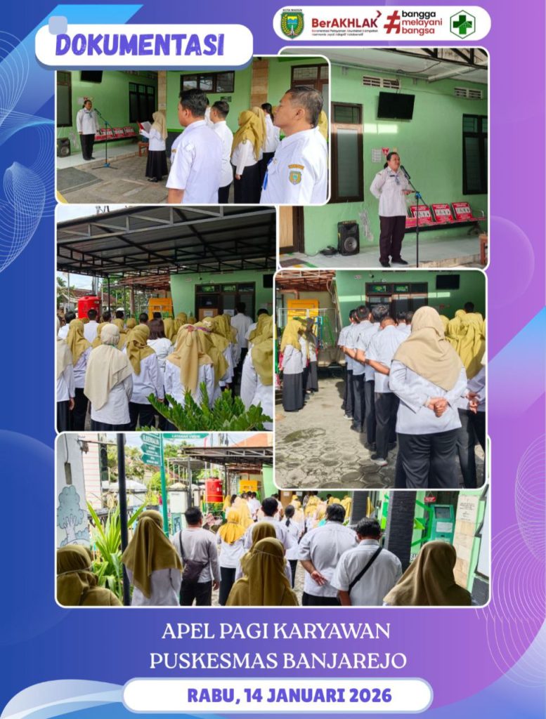Susunan acara Apel Karyawan diantaranya Pembacaan Panca Prasetya KORPRI, Asta Karya, SDGs, dan Visi Misi Puskesmas Banjarejo. dr. Rohlina Agustriningtias sebagai Kepala Puskesmas Banjarejo memberikan arahan kepada karyawan terkait kedisiplinan dan menyampaikan arahan dari Bapak Walikota Madiun.